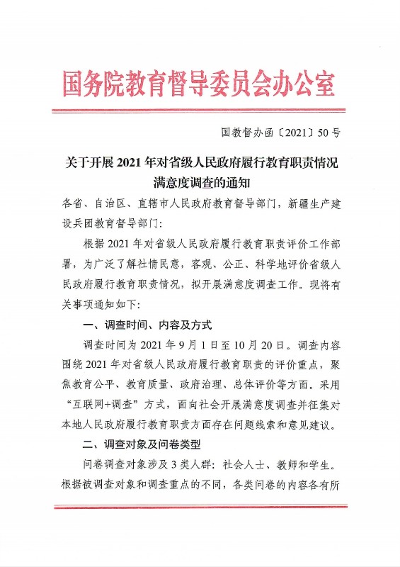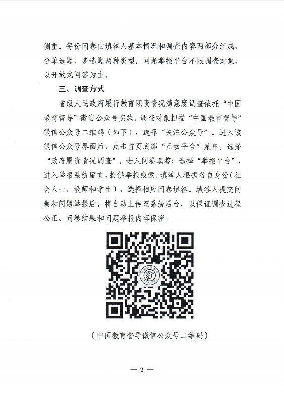 快来参与:扫描下方中国教育督导微信公众号二维码,选择“关注公众号”,点击首页底部“互动平台”进入“政府履职情况调查”。填答人可以根据身份(社会人士、教师和学生)参与问卷调查,也可以选择留言板,反映教育相关的问题线索和意见建议。